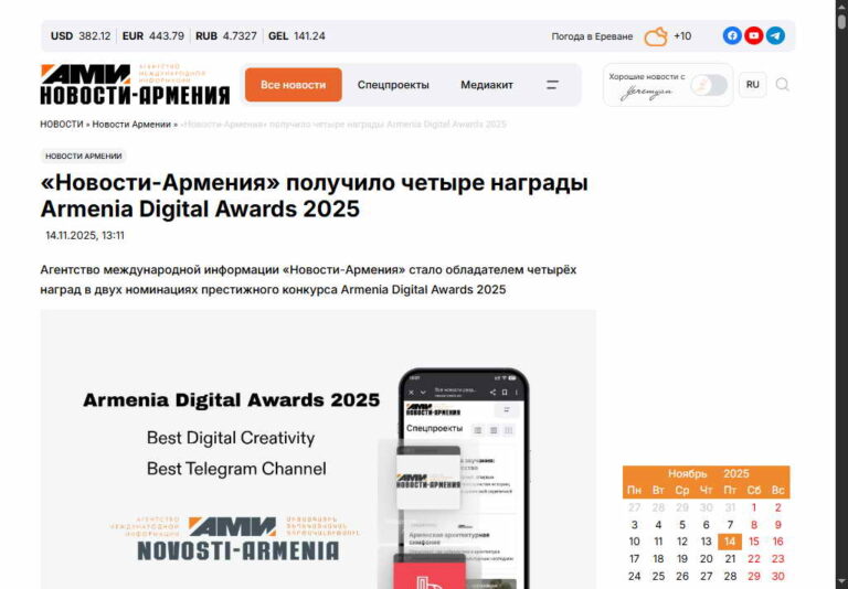 Информационное агентство «АРКА» стало победителем престижного национального конкурса Armenia Digital Awards 2025 сразу в двух ключевых номинациях