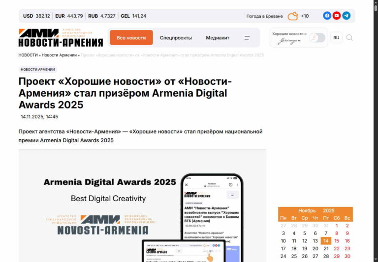 Проект агентства «Новости-Армения» — «Хорошие новости» стал призёром национальной премии Armenia Digital Awards 2025