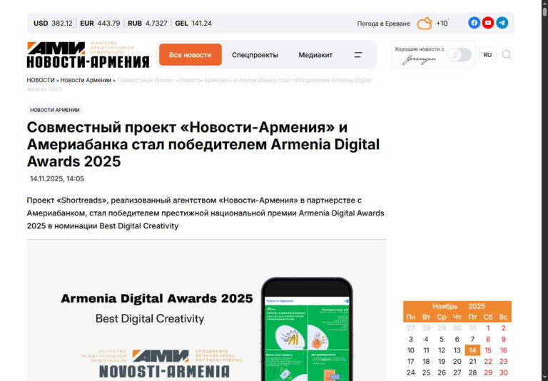 Проект «Shortreads», реализованный агентством «Новости-Армения» в партнерстве с Америабанком, стал победителем престижной национальной премии Armenia Digital Awards 2025 в номинации Best Digital Creativity